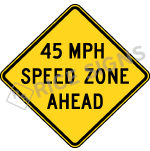 The Speed Zone Ahead sign indicates that drivers are approaching a section of roadway where speed limits may be lower than the posted limit, often due to hazardous conditions such as curves, intersections, or construction zones; this sign is designed to alert drivers to the upcoming changes in speed limit and encourage them to adjust their driving accordingly. This sign can be made with any speed.